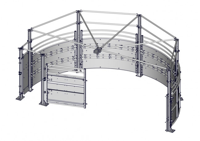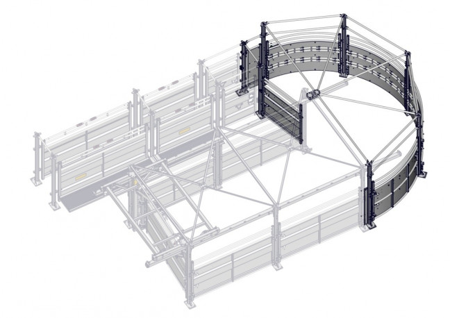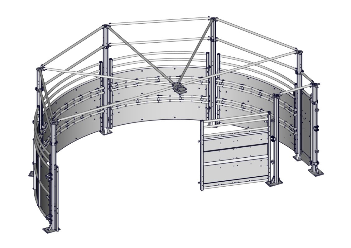 1/2 corral de contention PREMIUM pour couloir de poussé, il est prévu pour recevoir la barrière de poussée en rotation. Il est composé de 4 barrières cintrée -A- dont une est ouvrante par levier double AUTOLOCK breveté. Livré complet avec poteaux Trèfle sur platine, barres d'écartements. Verrouillage par cliquets de sécurité. Il peut fonctionner avec les 2 verrous autolock lors de la rotation de la barrière en version horaire ou bien anti-horaire. Il peut aussi avec un seul verrou fonctionner dans les 2 sens horaire et anti-horaire. Il est livré avec un portillon passage d'homme de sécurité de L.60 CM. Ce demi corral convient uniquement pour un couloir de poussée PREMIUM.