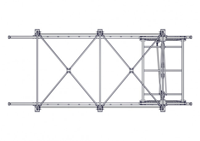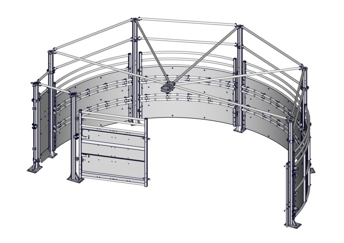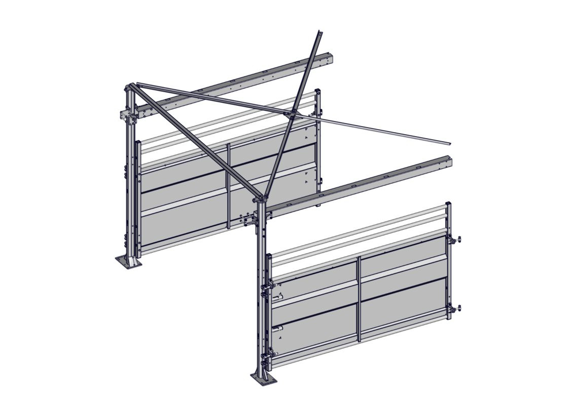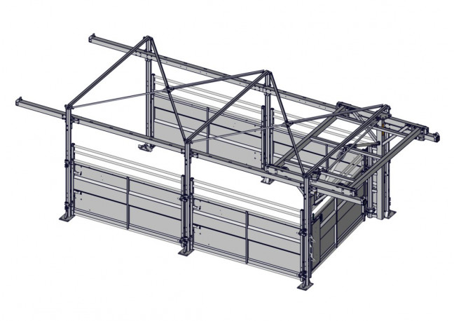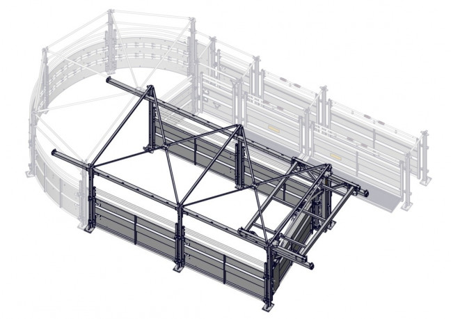 Couloir de poussée horaire PREMIUM L.5.30M. Composé d'un chariot équipé de 8 rouleaux de guidages. Verrouillage en automatique du chariot breveté. Fonctionnement sécurisé dans les 2 sens. Ossature rigide, poteaux trèfle avec croix d'équerrage, livré avec 4 barrières tôlées fixes pouvant être ouvrantes en option vers l’extérieur. En fin de parcours la barrière de poussée s'ouvre en toute sécurité et se verrouille en rotation dans le 1/2 corral PREMIUM.