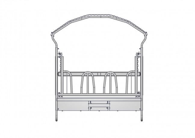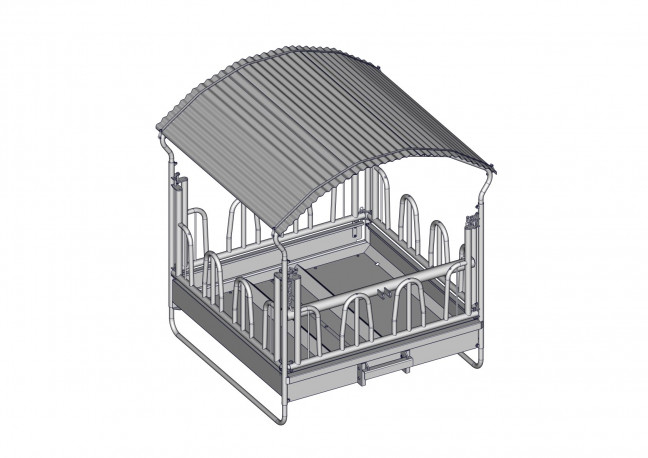 Râtelier 4 faces (2x2m) avec système de transport 3ième points, modèle 12 passages de têtes type PTF. Râtelier 4 faces (2x2m) avec système de transport 3ième points, modèle 12 passages de têtes type PTF pour bêtes encornées, comprenant un côté avec rebord d'auge ouvrant pour faciliter l'approvisionnement et le nettoyage.