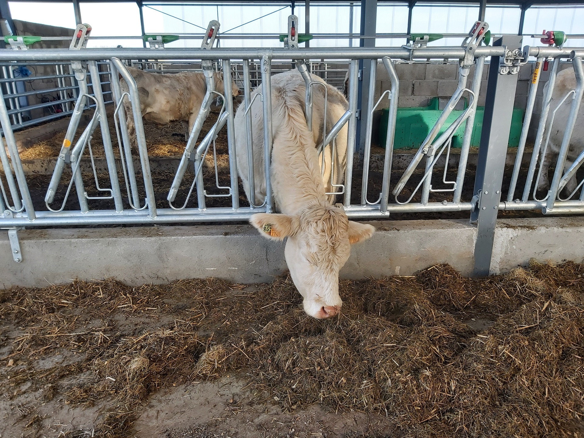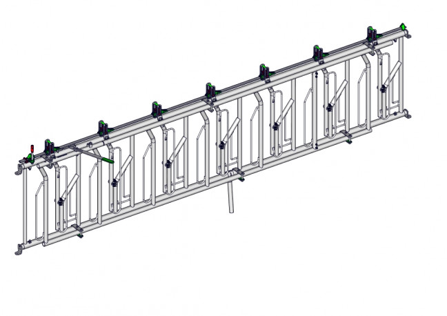Cornadis 7 places sur 5m à encolure réglable avec bras mobiles cintrés , offrant un grand passage de tête pour troupeaux à viande faiblement encornés. Equipé d'un double cadre et d'une poignée escamotable permettant un réglage collectif de l'encolure.