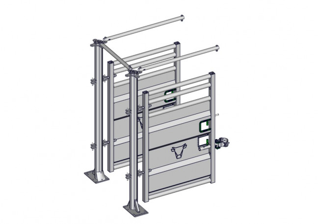 Sortie droite de contention PREMIUM elle est composée de 2 poteaux 2P avec barres d'écartements ainsi que 2 portillons tôlés fixes long 1.30M. Ils sont livrés avec 4 tiges à œil et 2 verrous AUTOLOCK. Le portillon extérieur contention est prévu en montage fixe (panneau), le portillon intérieur zone de travail est prévu en montage AUTOLOCK avec 1 bride surlock permettant de l'ouvrir pour traverser le couloir et sortir par le passage d'homme tôlé. Cette sortie droite peut être installée avec un demi-corral PREMIUM ou bien un couloir de poussée.