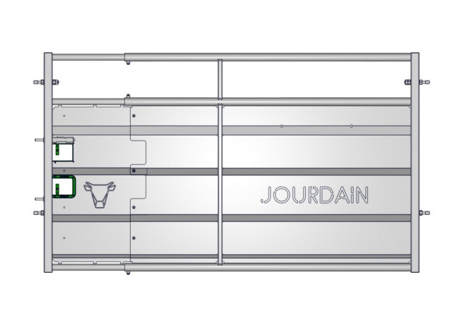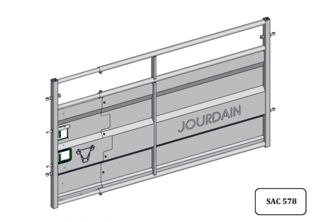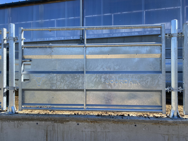 Barrière de contention tôlée réglable de 2.50m à 3m (axe-poteau ø 102mm) V2, hauteur de la barrière 1.60m et de la partie tôlée 1.14m.