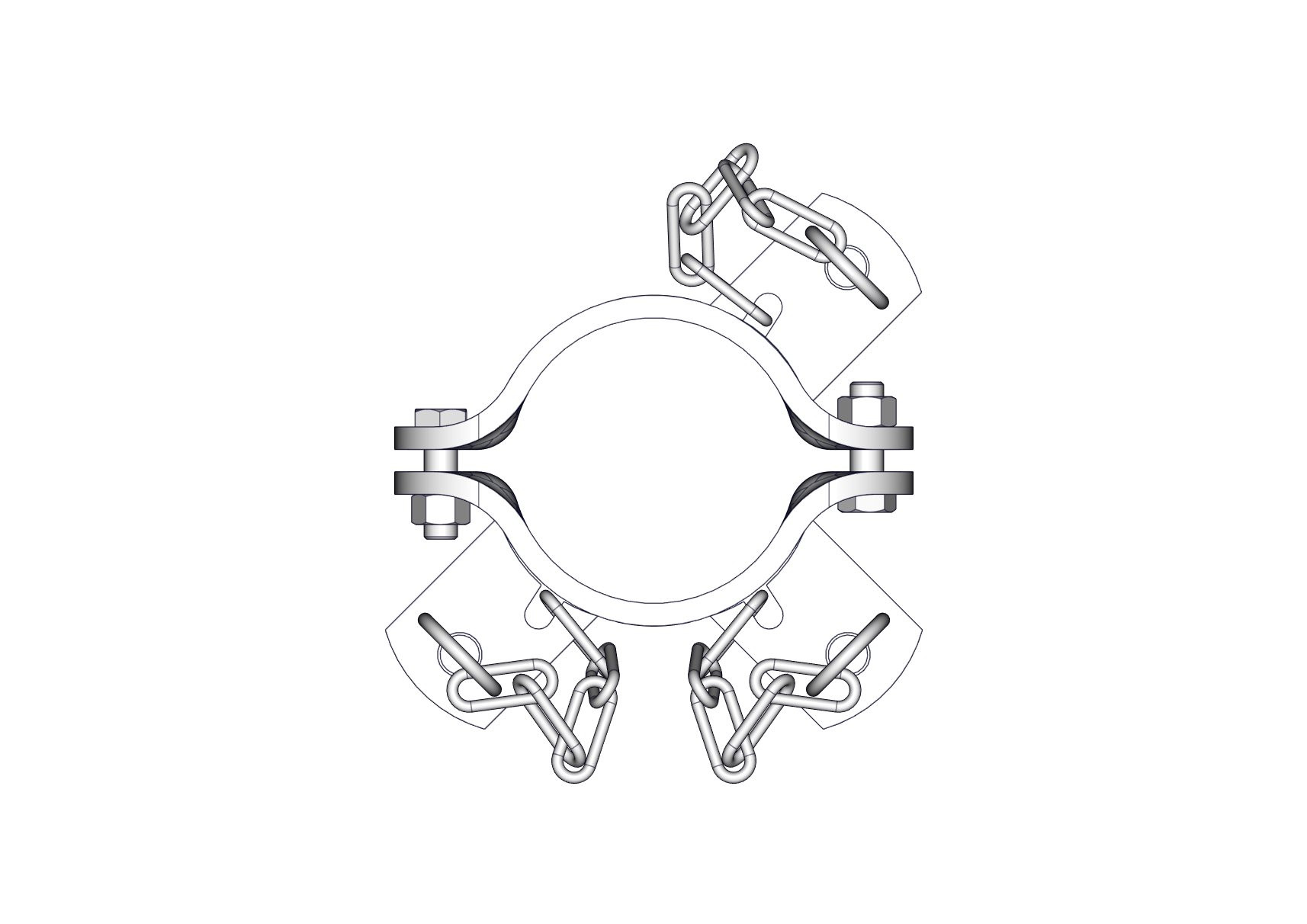 Bride Ronde 3 directions ø102mm réalisée en plat de 60x8mm d'épaisseur. De forme ronde. Elle est composée d'une demi-bride 2D et d'une demi-bride 1D ainsi qu'un sac de boulonnerie n°122