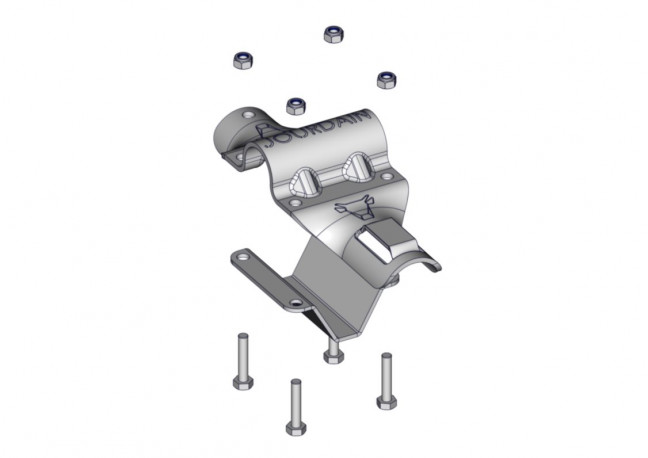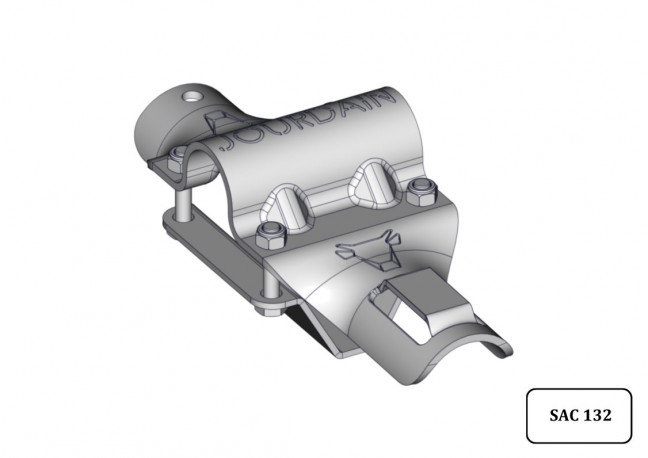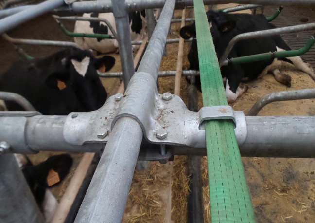 Bride sangle épaisseur 5mm permettant de fixer à la fois la barre garrot ø49mm et une sangle 50mm sur le bat flanc de logette. La sangle placée avant la barre garrot ø 49mm offre un contact plus confortable pour l'animal. Livré avec son sac de boulonnerie n°132