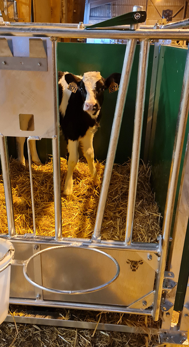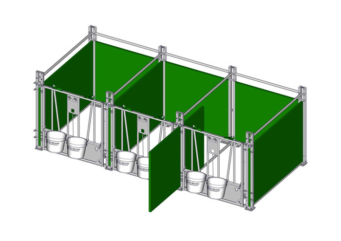 La façade reste facilement accessible grâce à une broche de verrouillage, elle est équipée de deux Cornadis manuels pour contrôler l'accès ou stabiliser un veau. Équipées de deux porte-seaux rabattables d'un diamètre de 28,5 cm, nos cases sont livrées avec deux seaux et la possibilité d'ajouter en option un seau à téter.