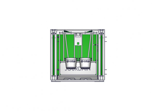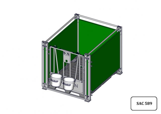 Case pour un veau laitier jusqu'à 6 semaines. Elle est constituée d'une structure métallique supportant 3 parois en polypropylène étanches d'épaisseur 35mm. La case est posée au sol sans roulettes, la hauteur totale est de 1.27m dont 1.14m de paroi. La dimension intérieurs est de 1.13m X 1.53m. Elle possède un caillebotis autoportant et anti dérapant d'épaisseur 15cm, le caillebotis est relevable sur la paroi pour simplifier le nettoyage (breveté). La façade est constituée de 2 cornadis manuels avec un porte seau et deux seaux de D.28.5cm, une broche de verrouillage permet son ouverture.