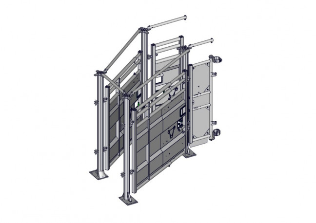 Chicane sortie courbe pour contention PREMIUM. Elle est composée de 4 poteaux avec barres d'écartements, 2 barrières tôlées réglables long 1.50/2M et un portillon tôlé passage d'homme. Le portillon tôlé passage d'homme côté zone de travail permettant une traversée du couloir et une sortie par le passage d'homme tôlé côté extérieur. Cette chicane peut être installée avec un demi-corral PREMIUM mais elle ne peut pas s'installer avec un couloir de poussé à cause de la largeur du couloir de poussée par rapport au marche pieds.