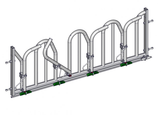 Cornadis Feston Autobloquant de 4 places sur 3m. Cornadis Feston Autobloquant de 4 places sur 3m. Ce modèle de cornadis est destiné aux bovins encornés. Les festons et bras mobiles sont fabriqués en tubes de 60mm et soudés sur une poutre Trèfle de 76mm. La manette de commande est en option, en cas de raccordement de tringle prévoir une manette pour 4 cornadis. Prévoir 2 renforts "muret préfabriqué" par cornadis de 5 et 6m.