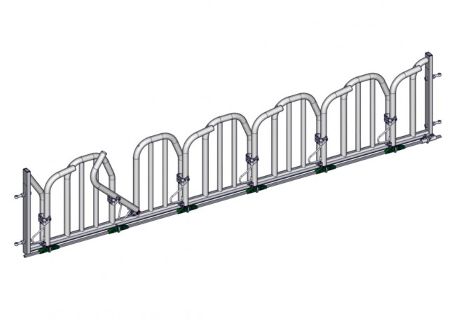 Cornadis Feston Autobloquant de 6 places sur 5 m. Cornadis Feston Autobloquant de 6 places sur 5m. Ce modèle de cornadis est destiné aux bovins encornés. Les festons et bras mobiles sont fabriqués en tubes de 60mm et soudés sur une poutre Trèfle de 76mm. La manette de commande est en option, en cas de raccordement de tringle prévoir une manette pour 4 cornadis. Prévoir 2 renforts "muret préfabriqué" par cornadis de 5 et 6m.