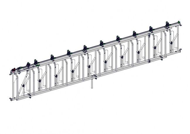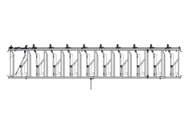 Cornadis 10 places sur 6m à encolure réglable avec bras mobiles cintrés , offrant un grand passage de tête pour troupeaux à viande faiblement encornés. Equipé d'un double cadre et d'une poignée escamotable permettant un réglage collectif de l'encolure. Cornadis avec axes coulissants en acier revêtus de polyamide choc , bras mobile renforcé par bague anti-usure , anti-passage de tête haut et bas. Fourni avec 4 embouts de réglage
