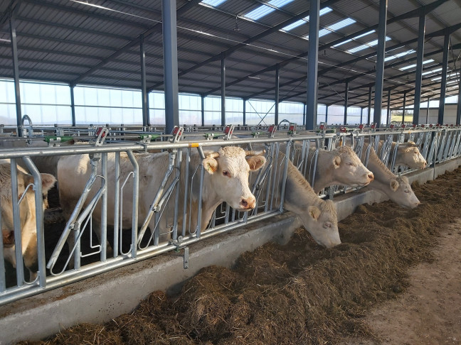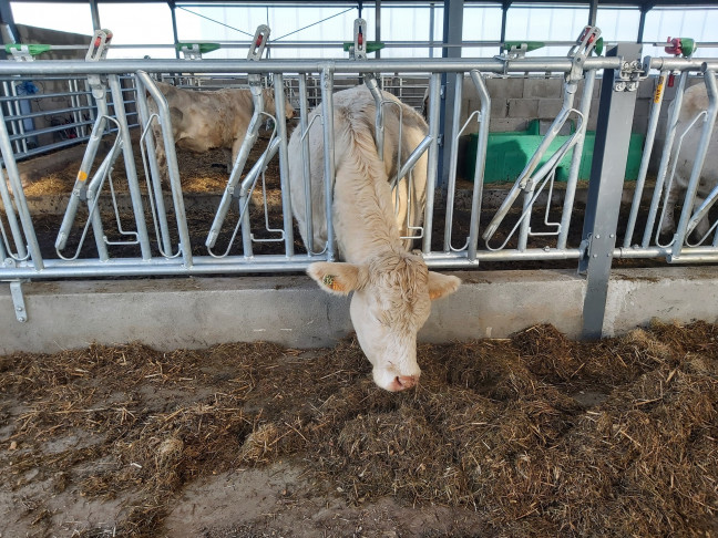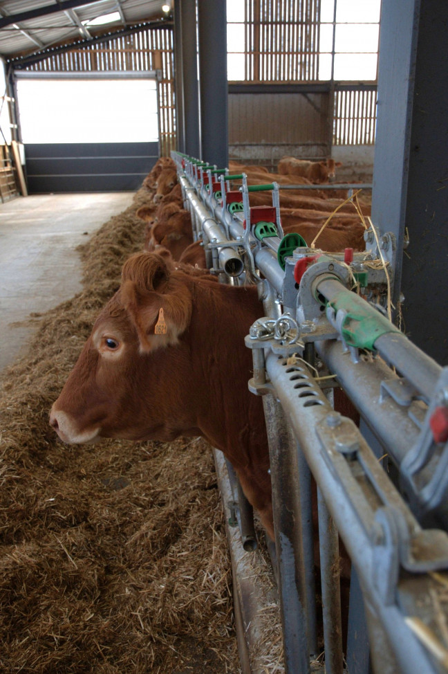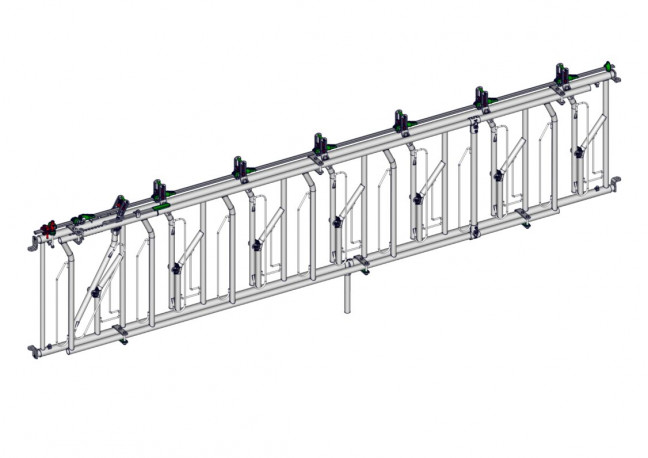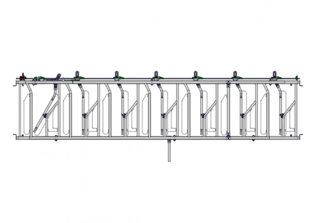 Cornadis 7 places sur 5m à encolure réglable avec bras mobiles cintrés , offrant un grand passage de tête pour troupeaux à viande faiblement encornés. Equipé d'un double cadre et d'une poignée escamotable permettant un réglage collectif de l'encolure.