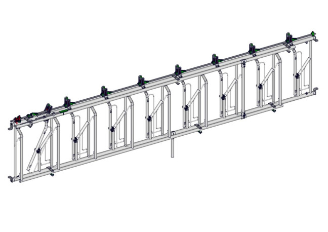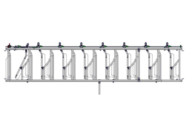 Cornadis 8 places sur 5.40 m à encolure réglable avec bras mobiles cintrés , offrant un grand passage de tête pour troupeaux à viande faiblement encornés. Equipé d'un double cadre et d'une poignée escamotable permettant un réglage collectif de l'encolure.