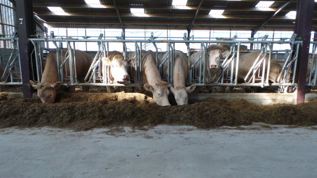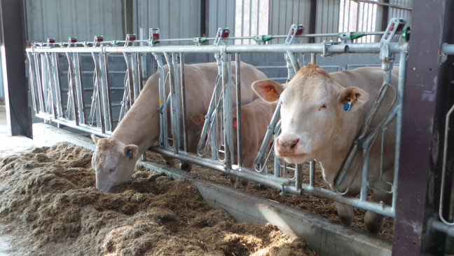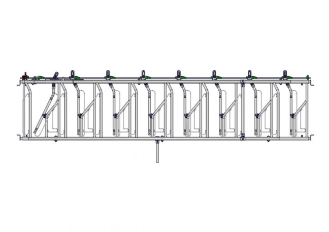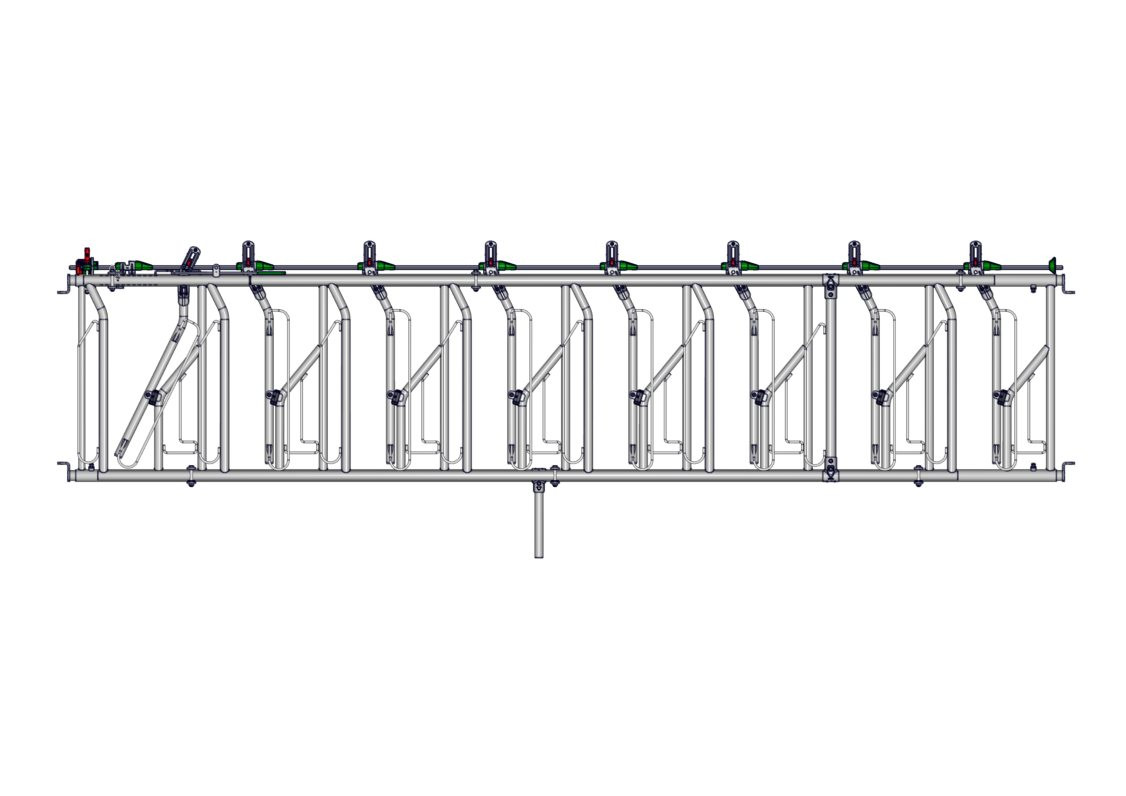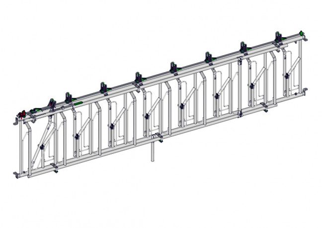 Cornadis 8 places sur 5m à encolure réglable avec bras mobiles cintrés , offrant un grand passage de tête pour troupeaux à viande faiblement encornés. Equipé d'un double cadre et d'une poignée escamotable permettant un réglage collectif de l'encolure.