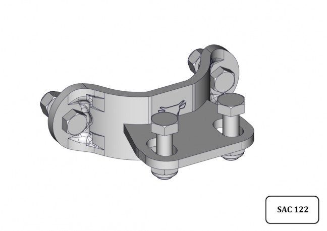 Demi bride Trèfle D.102mm fixation haute cornadis Demi bride Trèfle D.102mm fixation haute cornadis, livrée avec 2 boulons de 14mm permettant de fixer l'embout haut des cornadis SAFETY ou AXIAL en position incliné pour le raccordement des tringles.