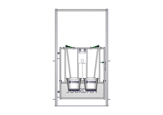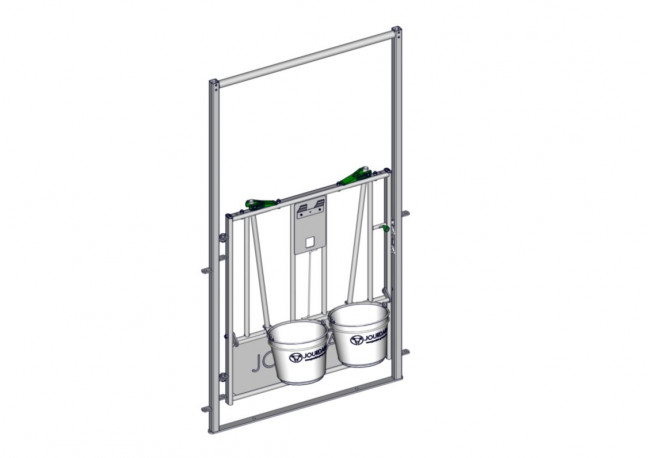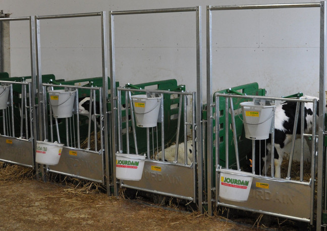 Façade de case à veau avec portillon ouvrant composé de 2 places de Cornadis manuel , 1 porte seau rabattable permettant de poser 2 seaux ø28.5cm et 1 support pour seau à téter.