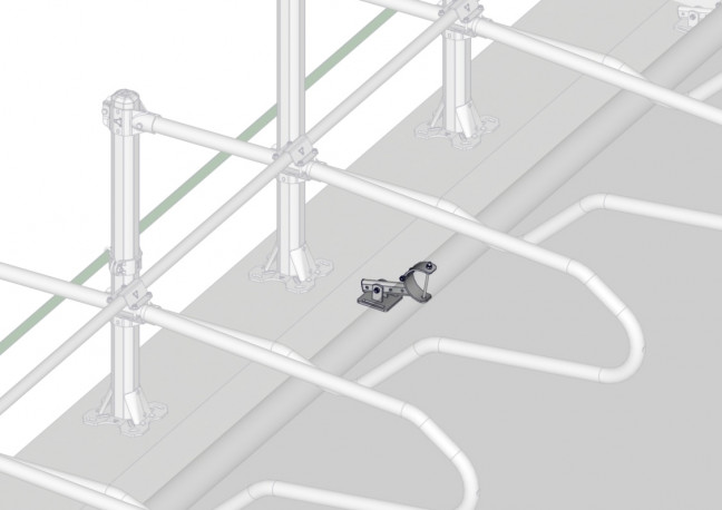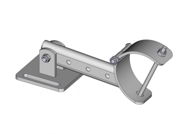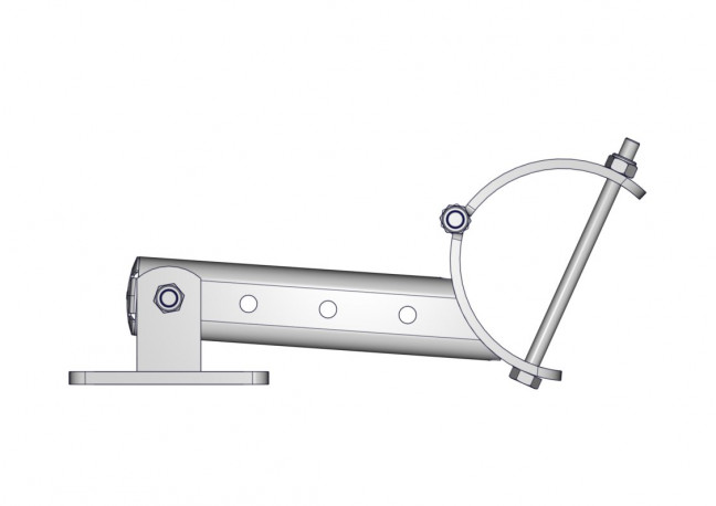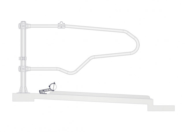 Genouillère articulée, elle est constituée d'une chape d'articulation avec trou oblong fixée par cheville sur le béton. Le bras de genouillère étant articulé il retombe par son poids sur le tapis et permet de maintenir un tube pvc haute pression. Le tube PVC peut être de différents diamètres 125 145 ou 165mm. Fixer le tube par le boulon fournit.