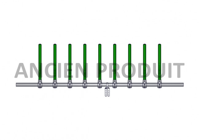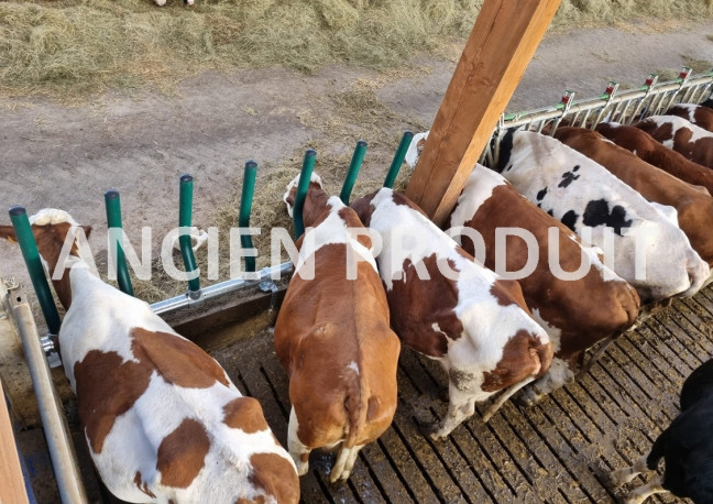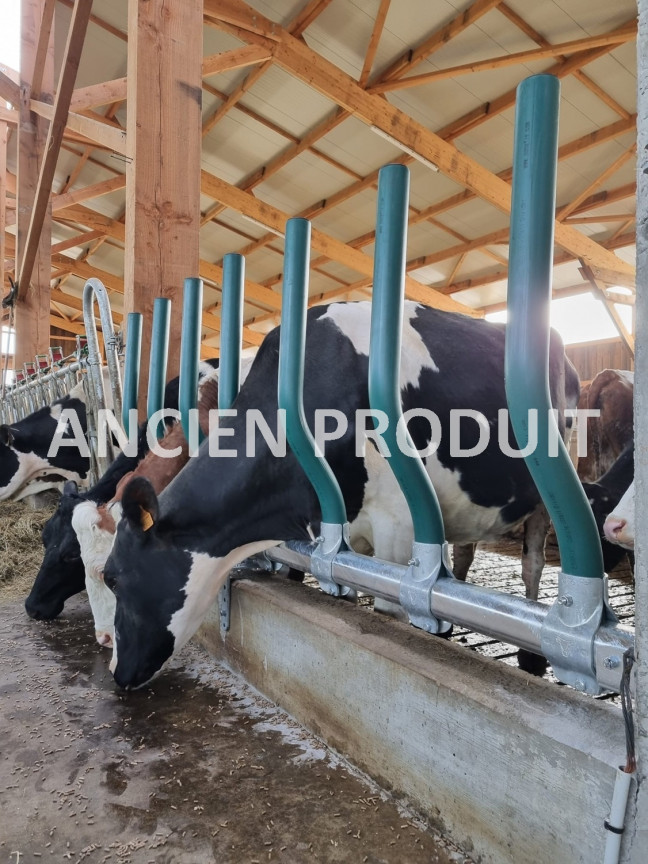 Libre Service Confort Plus Laitier Vert de 10 places sur 4m sans embout de fixation constitué de 9 tubes en PEHD Vert de 76mm, de 9 brides Trèfle D.102mm/76mm, d'un renfort muret confort plus et d'un tube Trèfle D.102mm longueur 4,45m à recouper sur place. Le libre service pour bovin laitier est confortable et réglable en largeur. Pensez à commander les chapes de montage murale ou bien les brides D.102mm pour montage entre potelet D.102mm.