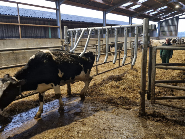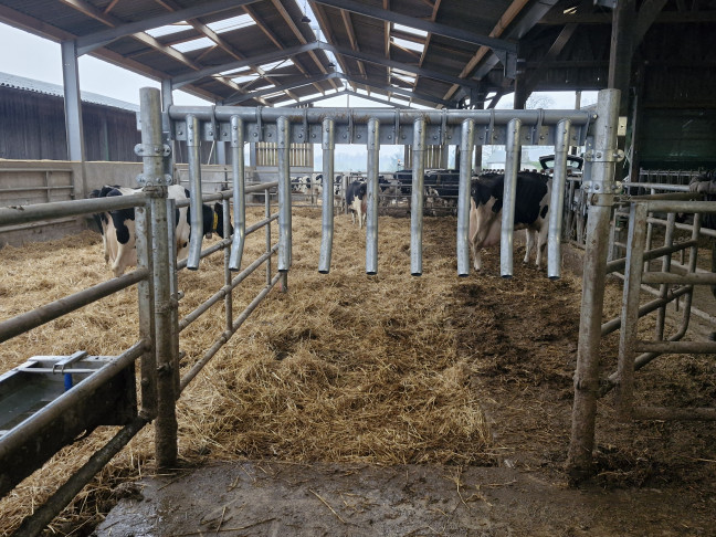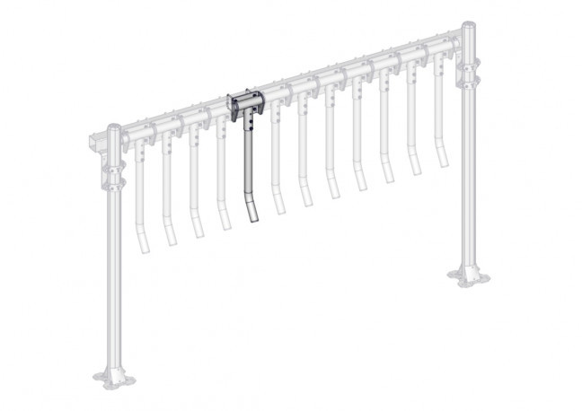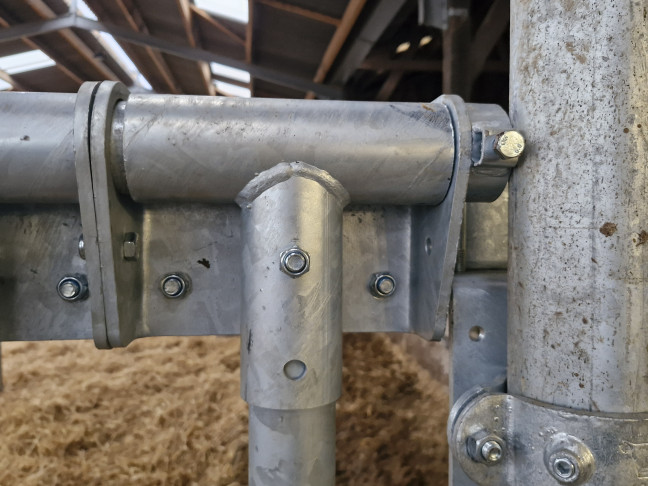 Système d’anti-retour type finger pour bovin laitier, il permet de créer un sens de circulation unique dans le bâtiment. Le module finger est construit avec un tube de D.60mm avec un mouvement pendulaire autour d’un tube D.60mm réalisant l’axe de rotation. La platine pliée du module finger se fixe sur une poutre horizontale carrée de 100mm avec 2 cavaliers de D.12mm. Les modules sont boulonnés les uns aux autres