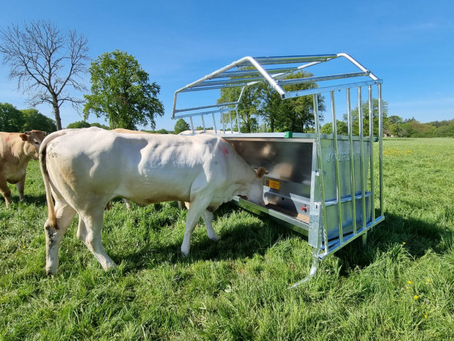Nourrisseur pour bovin adulte de longueur 2.50m. Construit en tôles galvanisées, il possède une trappe permettant de régler le débit de distribution de l'aliment, un large toit basculant avec tube intérieur de renfort sur le devant. Les pieds possèdent 2 hauteurs de montage, le nourrisseur est positionné au plus haut pour une utilisation en gros bovin. D'une capacité d'aliment de 1180 Litres, il est livré colisé avec son système de transport par 3 points arrière. Pour un transport sur route veuillez le transporter vide et vous conformer à la législation en vigueur.