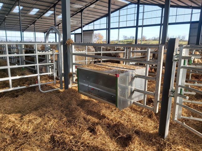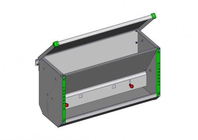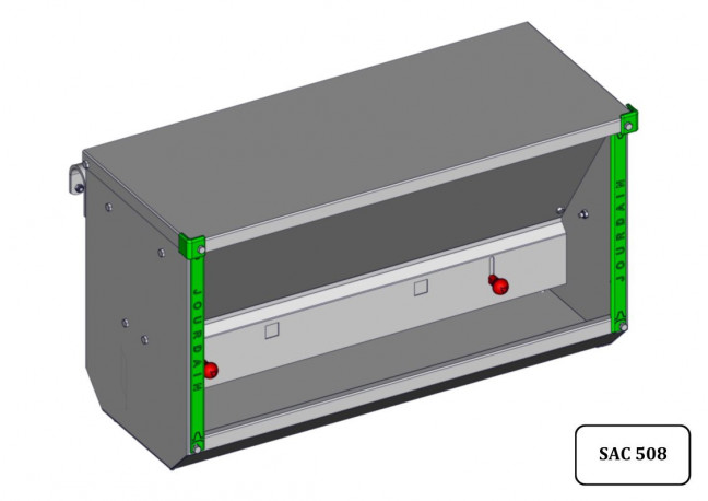 Nourrisseur d'appoint Nourrisseur d’appoint, longueur 1.20m, largeur 47cm, hauteur 66cm, venant se fixer sur une barrière. Protections de cou et de coins de toit incluses. Capacité 190L avec trappe pour le réglage du débit (destiné au petit bétail). Réalisé en tôle galvanisée et livré en kit.