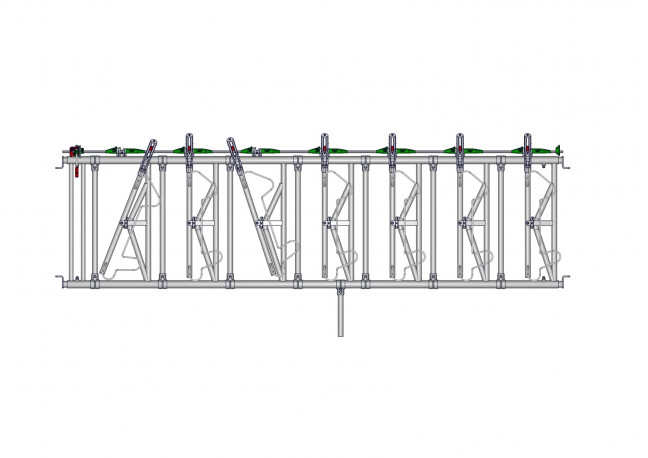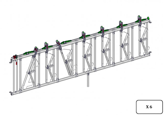 Cornadis de sécurité 7 places sur 4m à encolure réglable. Cornadis avec axes coulissants en acier revêtus de polyamide choc , bras mobile renforcé par bague anti-usure , anti-passage de tête haut et bas et retour du collier grâce au système RAZ (remise à zéro). Fourni avec 4 embouts de réglage