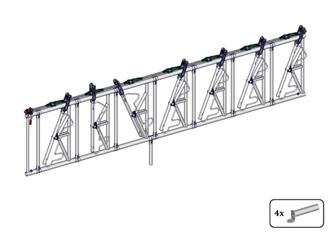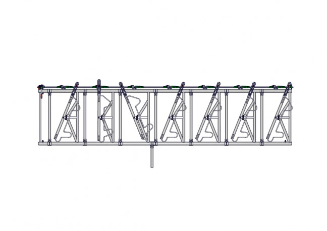 Cornadis de sécurité 7 places sur 4.80m à encolure réglable. Cornadis de sécurité 7 places sur 4.80m à encolure réglable. Cornadis avec axes coulissants en acier revêtus de polyamide choc, bras mobile renforcé par bague anti-usure, anti-passage de tête haut et bas et retour du collier grâce au système RAZ (remise à zéro). Fourni avec 4 embouts de réglage.