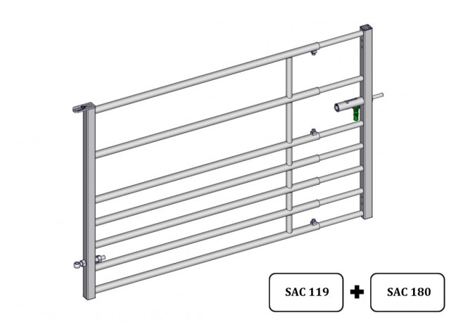 Porte extensible 7 lisses petit bétail de 2/3m avec 1 verrou AUTOLOCK. Cette porte extensible est fabriquée en tube de D.40mm pour la partie arrière avec une série d'entretoises D.34mm et une tige à œil de réglage en hauteur. La partie avant est fabriquée en tube D.32mm et possède un verrou Autolock. Elle est utilisée en intérieur de bâtiment pour le veau, le mouton et la chèvre. Les petites dimensions se fixent sur un poteau Trèfle D.76mm mais prévoir un poteau D.102mm à partir de 3m de longueur.