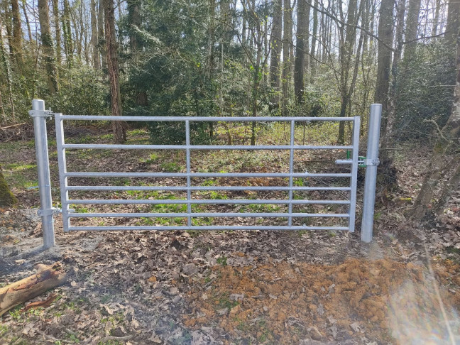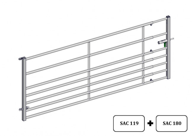 Porte extensible 7 lisses petit bétail de 3/4m avec 1 verrou AUTOLOCK. Cette porte extensible est fabriquée en tube de D.40mm pour la partie arrière avec une série d'entretoises D.34mm et une tige à œil de réglage en hauteur. La partie avant est fabriquée en tube D.32mm et possède un verrou Autolock. Elle est utilisée en intérieur de bâtiment pour le veau, le mouton et la chèvre. Les petites dimensions se fixent sur un poteau Trèfle D.76mm mais prévoir un poteau D.102mm à partir de 3m de longueur.