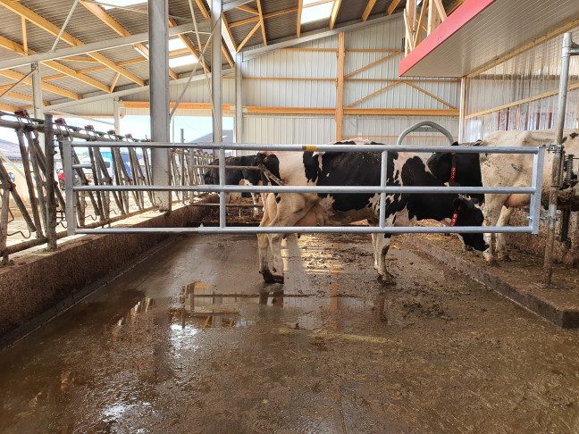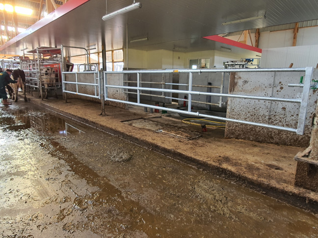 Porte MILKY EX3 Autolock 4/5m complète. Cette barrière de hauteur 80cm est idéale dans le couloir de raclage des bâtiments laitiers car elle permet le passage des robots de raclage sous la barrière.