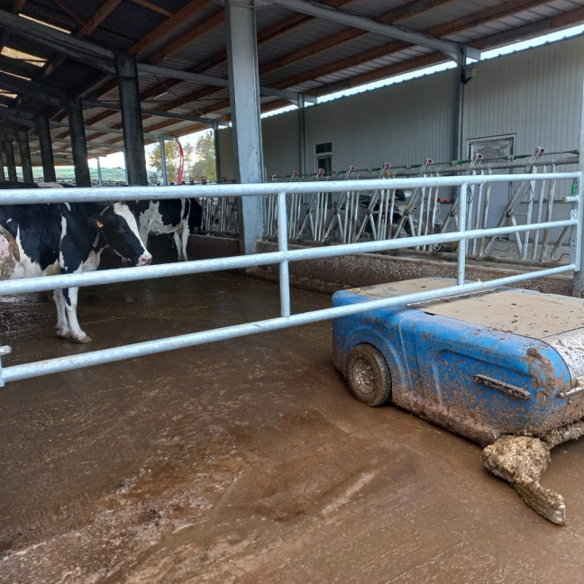 Porte MILKY EX3 Autolock 5/6m complète. Cette barrière de hauteur 80cm est idéale dans le couloir de raclage des bâtiments laitiers car elle permet le passage des robots de raclage sous la barrière.