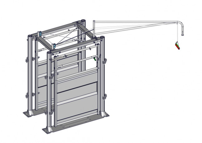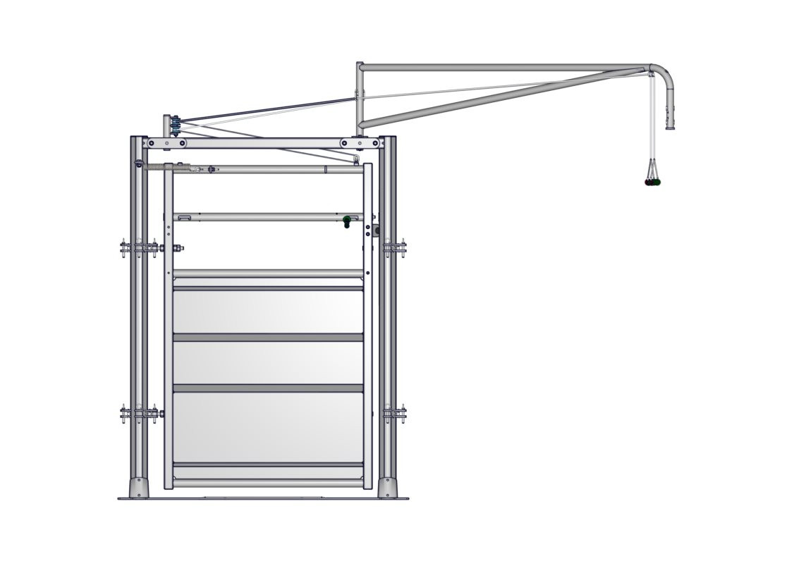 Porte de tri 3 voies permettant avec une simple corde de trier les animaux selon 3 directions (tout droit, vers la droite ou bien vers la gauche). Elle est construite à partir d'un cadre en tube Trèfle de 102mm, est équipée de 2 portillons tôlés articulés mobiles grâce à une corde et se referme par un ressort de rappel. La porte de tri se positionne le plus souvent après la cage de contention. Elle est livrée en kit.