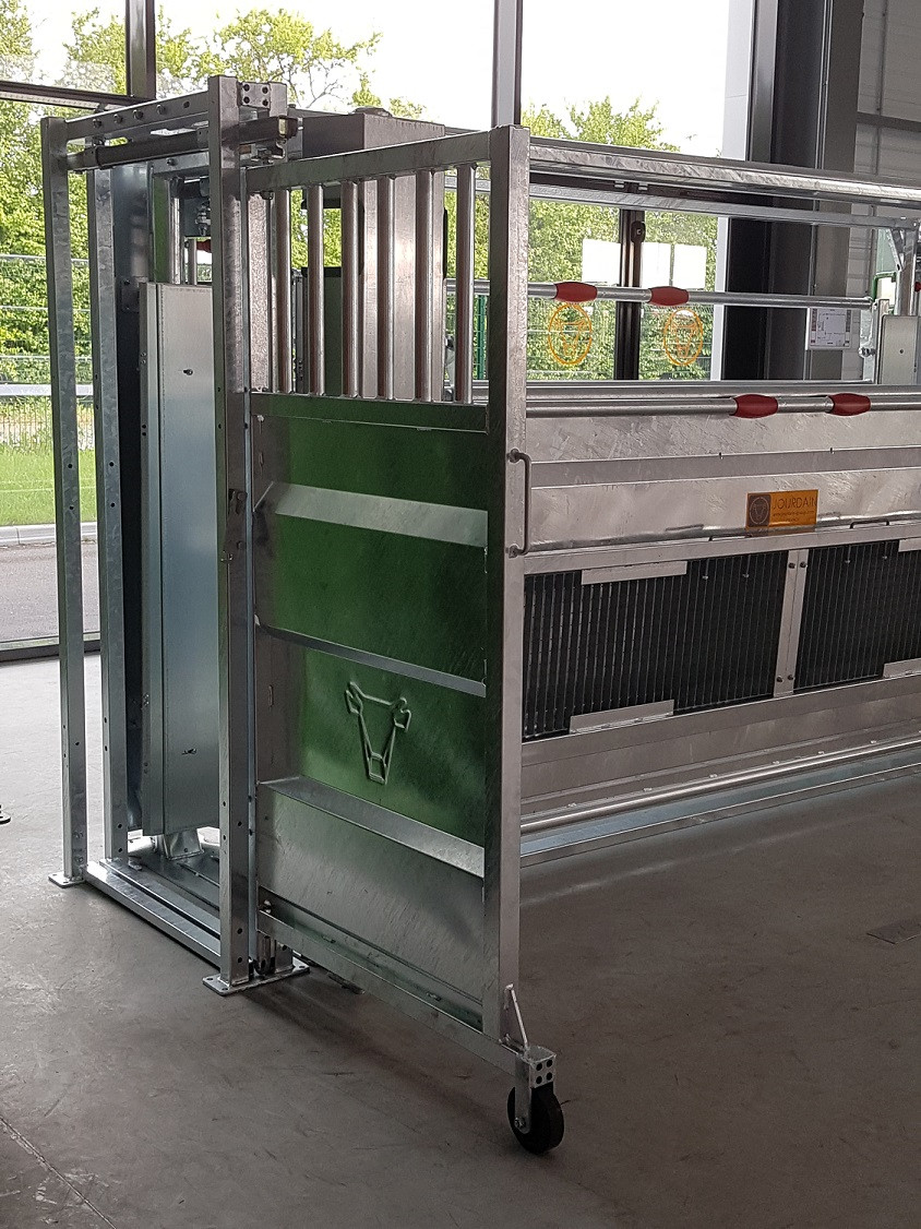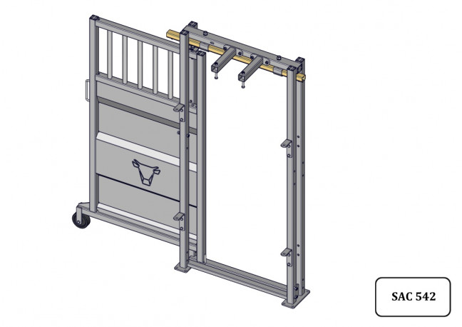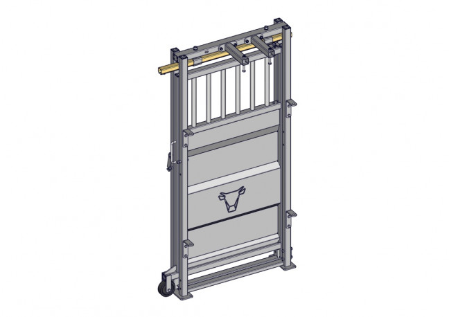 Porte sectionnelle coulissante sur platine permettant d'arrêter les animaux pour que l'éleveur effectue un travail en toute sécurité, notamment à l'arrière de la cage de contention. Elle comporte des plats pour se brocher sur le poteau de contention.