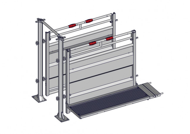 Elément de 2m complet pour rallonger un couloir fixe sur platine. Cet ensemble de pièces permet de rallonger un couloir fixe d'une longueur de 2m. Il est composé de 2 barrières tôlées à lisse rabattable de 2m, 1 marchepied relevable avec sa rallonge, 2 poteaux de contention 2D sur platine avec son entretoise.