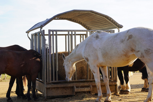 Râtelier 4 faces (2x2m) avec système de transport 3ième points, modèle 12 passages de têtes type CHEVAL. Râtelier 4 faces (2x2m) avec système de transport 3ième points, modèle 12 passages de têtes type CHEVAL.