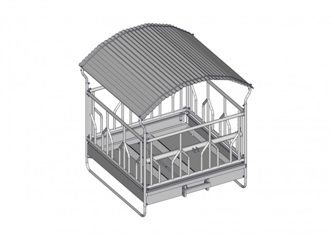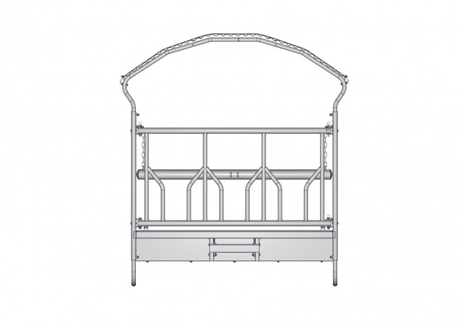 Râtelier 4 faces (2x2m) avec système de transport 3ième points, modèle 12 passages de têtes type Festons. Râtelier 4 faces (2x2m) avec système de transport 3ième points, modèle 12 passages de têtes type Feston pour bêtes écornées, comprenant un côté avec rebord d'auge ouvrant pour faciliter l'approvisionnement et le nettoyage.