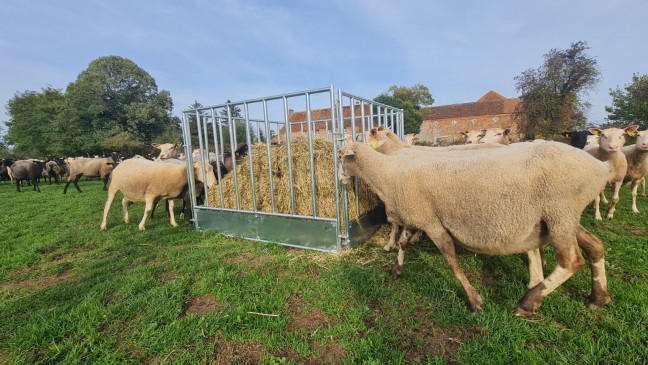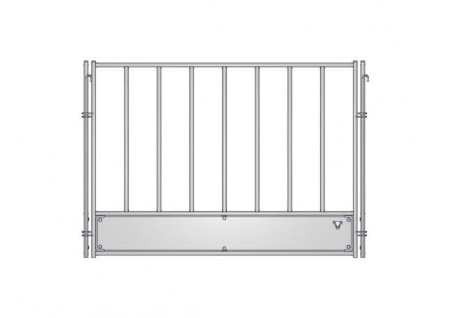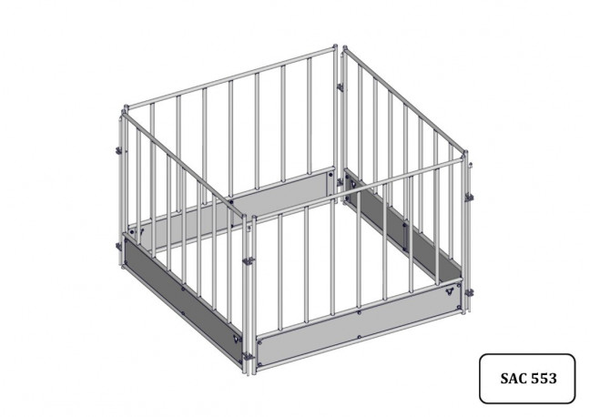 Râtelier BASIC petit bétail 1.60m x 1.60m pour une balle de 1.40m Râtelier BASIC petit bétail carré de 1.60m, contruit en tube D.27mm. Barre verticale D.27mm grugés et soudés de 2 côtés. Hauteur 1.15m avec une partie tôlée de 27cm. Dimension pour le cou 16.5cm, râtelier prévu pour l'ovin et le caprin sans cornes. Fixation par broche permettant l'ouverture pour l'approvisionnement de la balle.
