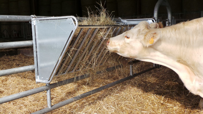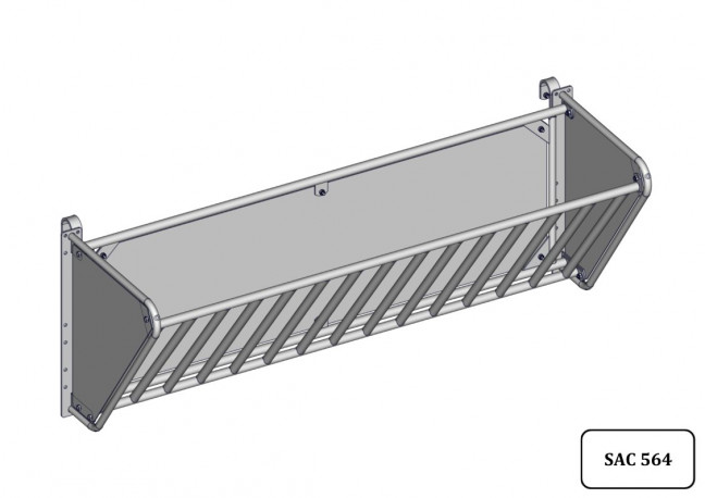 Ratelier modulable sur barrière modèle "vache" long 2m. Ratelier modulable sur barrière modèle "vache" long 2m. Ratelier se posant sur une barrière, fond et côtés tôlés barreaudage en tube D.34mm. Espace entre barreau 10cm pour bête adulte.