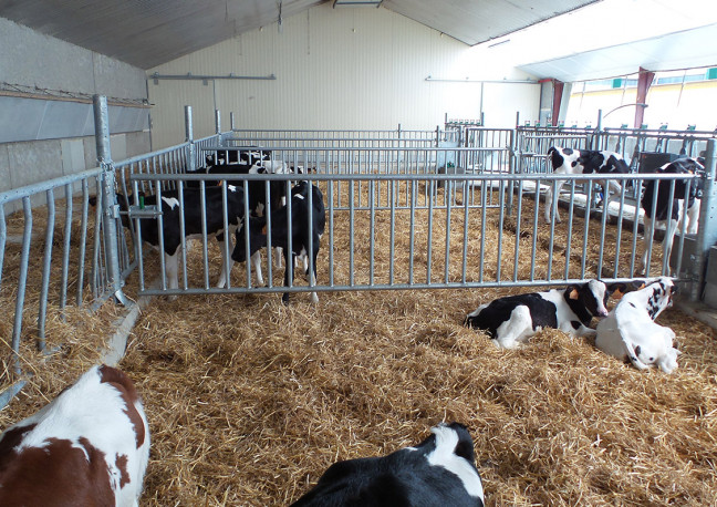 Séparation à veau de 4m à barreaudage vertical, hauteur 80cm réalisé en tube ø34mm et 42mm. Elle permet de créer des boxes.