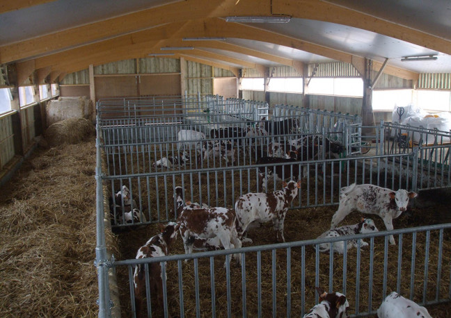 Séparation à veau de 5m à barreaudage vertical, hauteur 80cm réalisé en tube ø34mm et 42mm. Elle permet de créer des boxes.