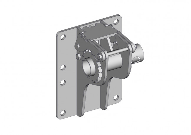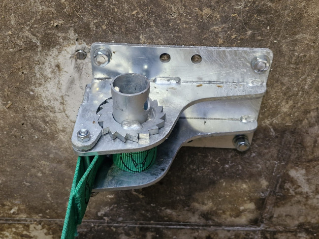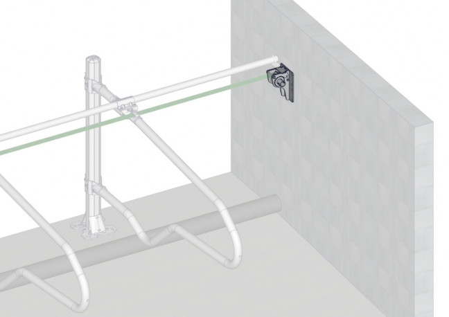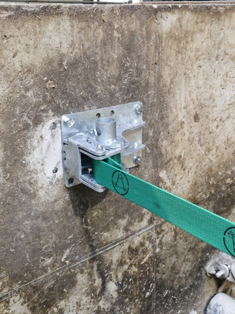 Support mural tendeur de sangle. Il se cheville dans le mur d'extrémité de la ligne de logette et permet de tendre une sangle de 50mm. La sangle associée à une bride sangle réalise un arrête au garrot confortable, la sangle peut aussi servir d'anti passage dans les logettes.